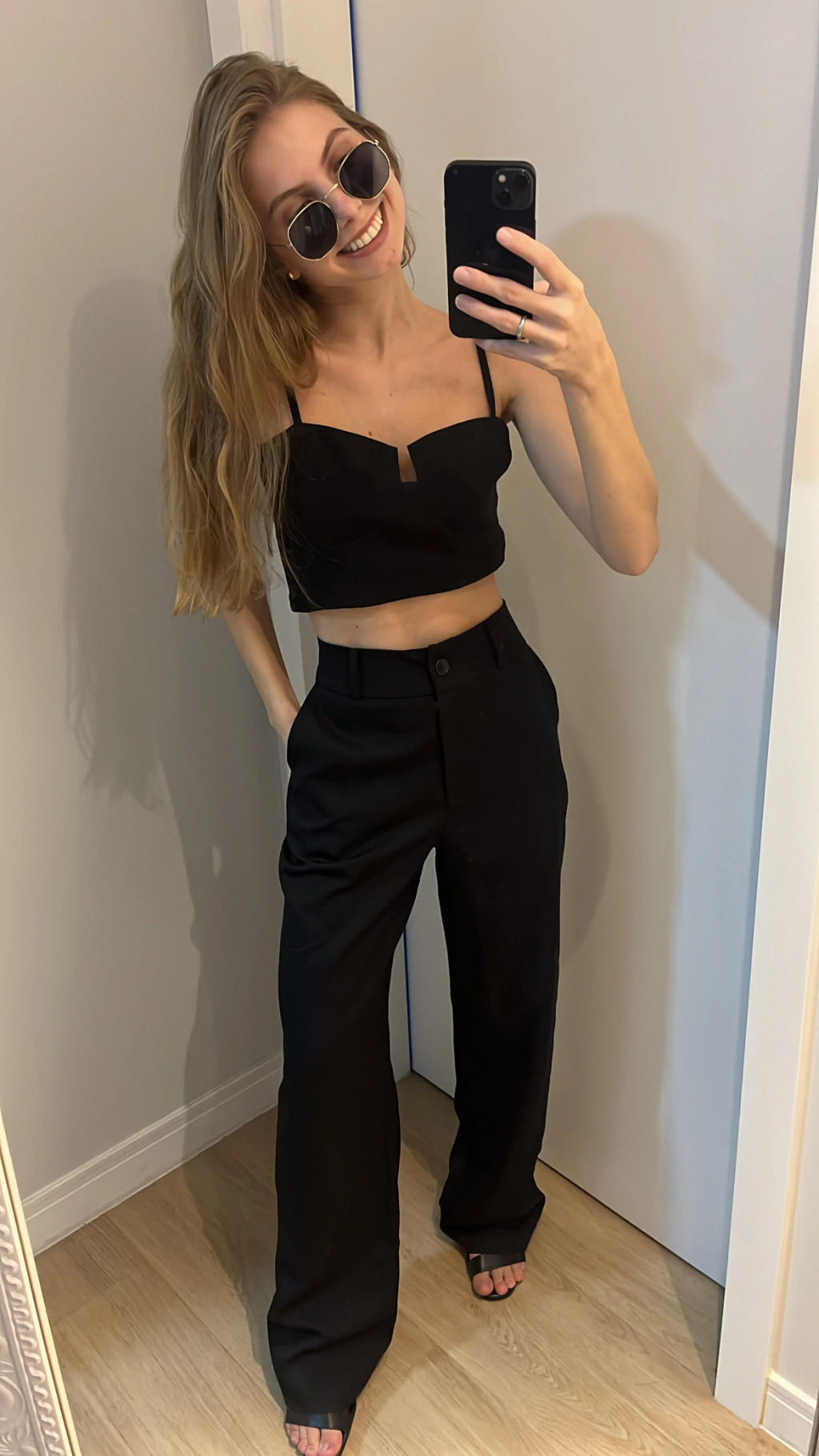 Confeccionado em crepe alfaiataria. Conjunto Millano, composto por blusa modelo peplum, com alças finas ajustaveis para um caimento perfeito! Seu fechamento por zíper visivel, com detalhe no busto que adiciona um toque sofisticado à peça. A calça, modelo pantalona, possui fechamento por botão e zíper, passantes para cinto e bolsos facas. Não possui transparência.