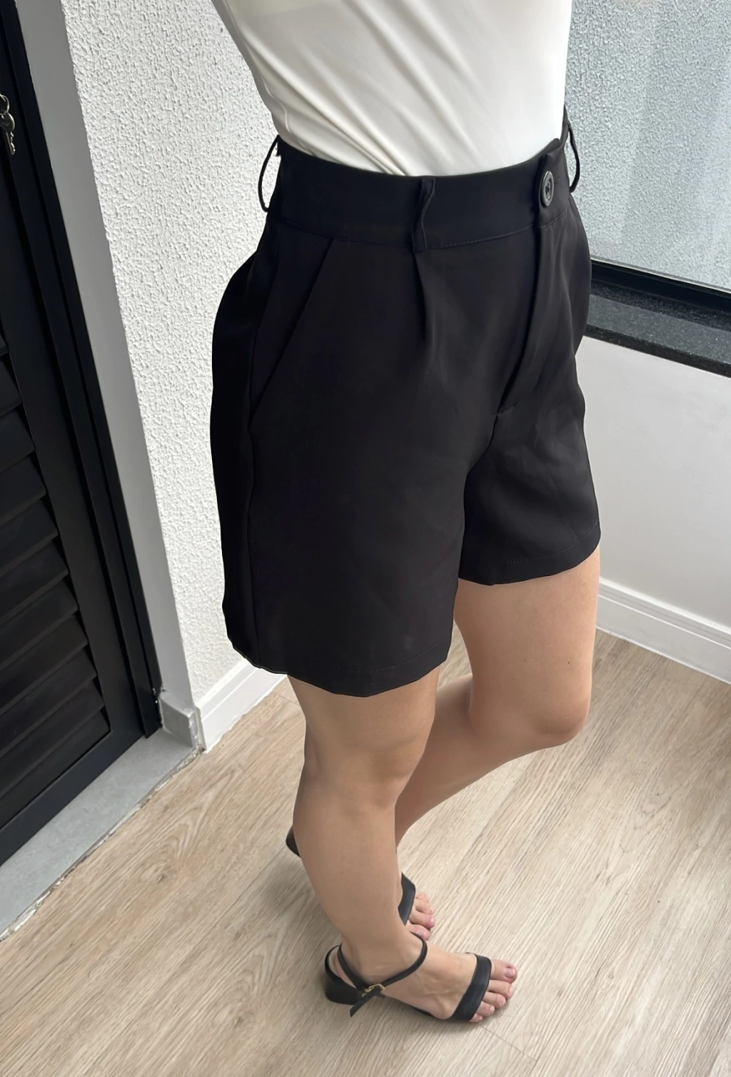 Short com bolsos laterais, fechamento frontal por zíper e botão.